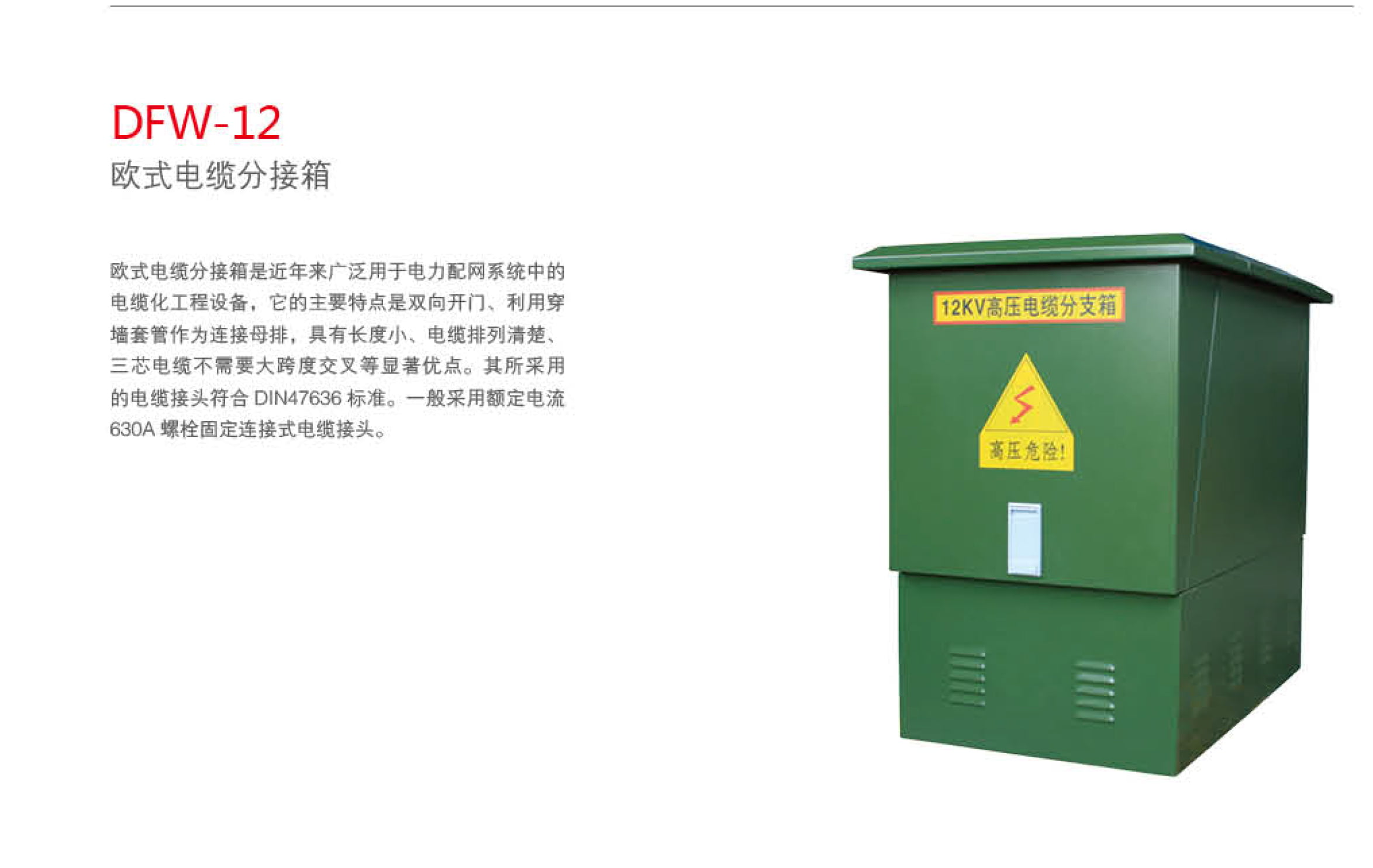歐式電纜分接箱是近年來廣泛用于電力配網(wǎng)系統(tǒng)中的電纜化工程設(shè)備,它的主要特點是雙向開門、利用穿墻套管作為連接母排,具有長度小、電纜排列清楚、三芯電纜不需要大跨度交叉等顯著優(yōu)點。其所采用的電纜接頭符合 DIN47636 標(biāo)準(zhǔn)。一般采用額定電流 630A 螺栓固定連接式電纜接頭。