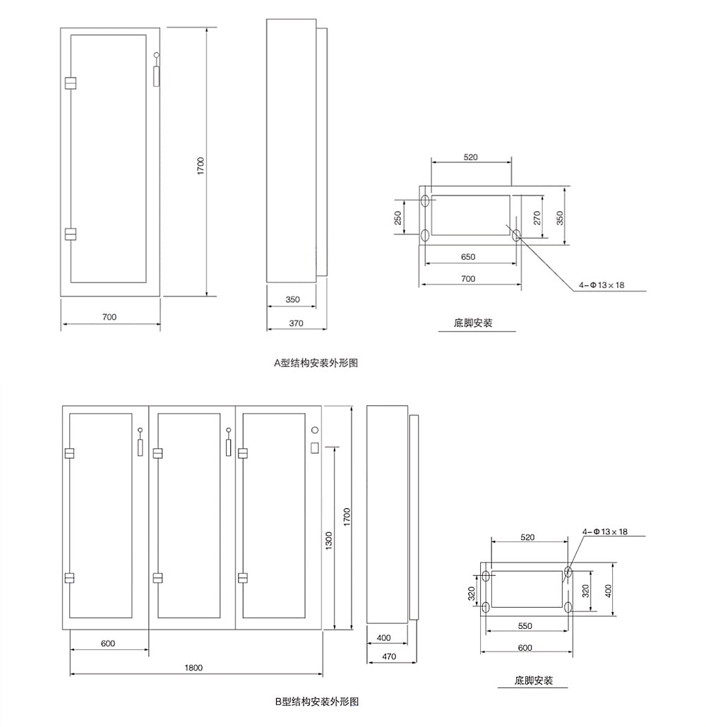 XL-21 型低壓動(dòng)力配電箱系戶內(nèi)裝置墻安裝,屏前檢修。